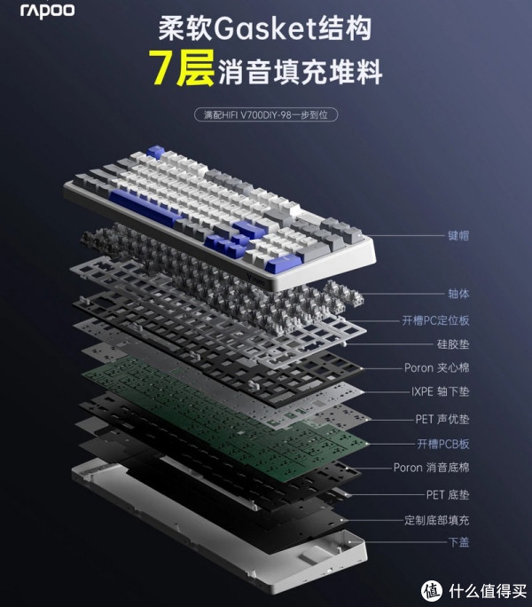 雷柏V700DIY-98机械键盘的设计基于创新的柔韧Gasket结构,7层消音填充堆料,双层PO棉PCB单键1.3mm开槽,这一结构极大地提升了键盘的手感与声音表现。Gasket结构意味着键盘的按键在按下去时不会产生过多的“回响”或“金属音”,而是提供了更加舒适、稳定的击键反馈。在键盘的内部,采用了7层消音填充堆料,包括双层PO棉的设计,进一步降低了打字和游戏时的噪音,确保了安静的操作体验。这对于长时间打字或进行激烈游戏的使用者来说,尤为重要。